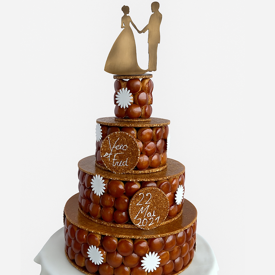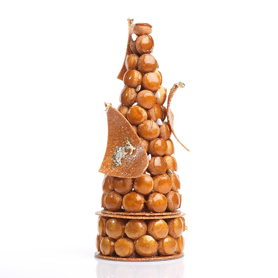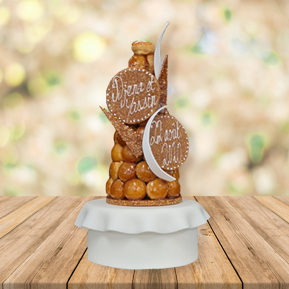 Nos créations artisanales se déclinent en formes traditionnelles de cône ou de tambour, composées de choux délicatement garnis d'une crème pâtissière et d’une plaque en nougatine personnalisée avec l’inscription de votre choix.